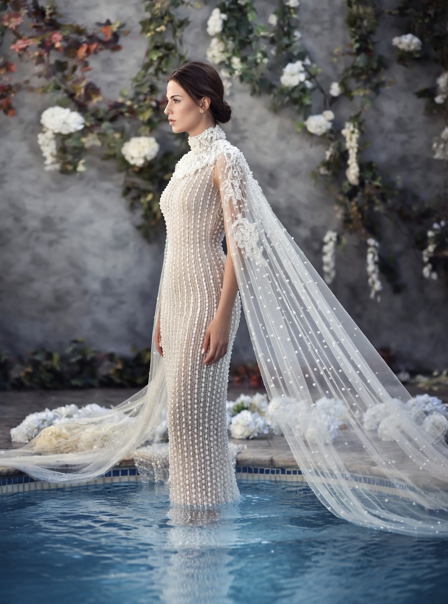 Inspired by the serene intersection of water, light, and blooming florals, this gown blurs the line between bridal couture and high-fashion editorial. The vertical beading evokes cascading waterfalls, while the flowing cape creates an almost liquid movement — perfect for poolside, garden, or destination wedding editorials. Ideal for the modern bride who desires timeless glamour with a bold, memorable statement.